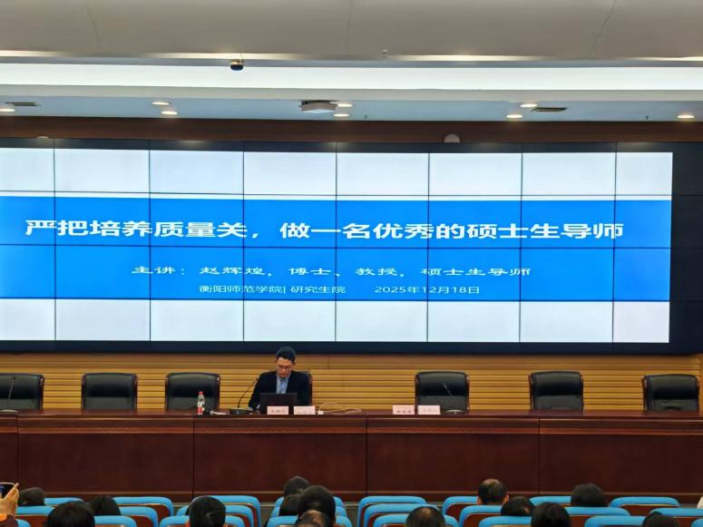 12月18日,衡阳师范学院研究生学院副院长赵辉煌教授以“严把培养质量关,做一名优秀的硕士生导师”为主题,从培养制度、导学关系、导师职责、培养成效等方面展开。赵教授强调,导师应恪守“严管厚爱”原则,严格过程管理,注重学术规范,强化学科特色,切实担负起研究生培养第一责任人的使命。