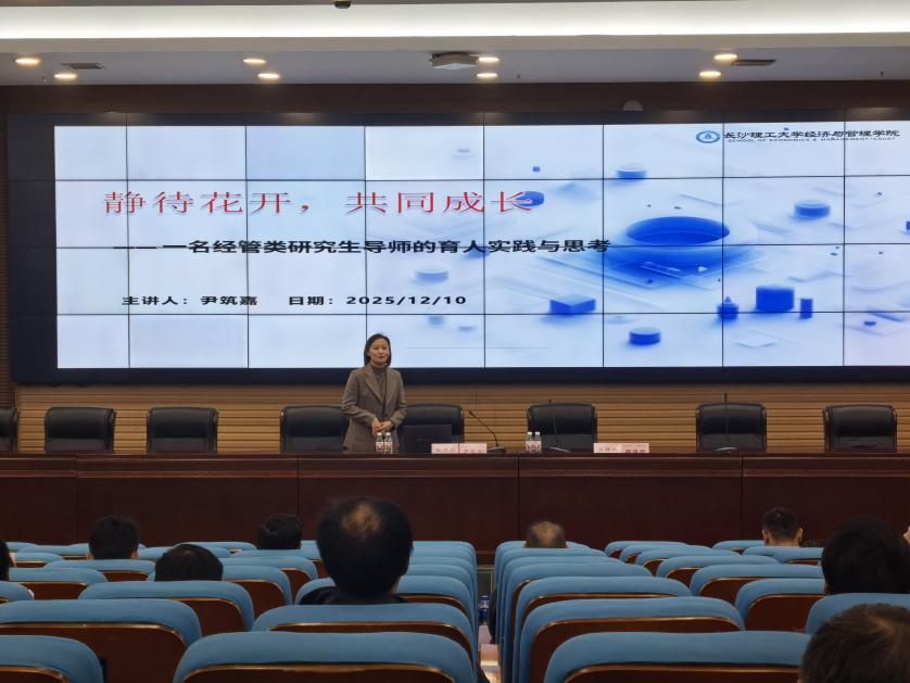 12月10日,长沙理工大学经济与管理学院副院长尹筑嘉教授以“静待花开,共同成长”为主题,围绕学术指导、能力拓展、人文关怀、师德与团队四个方面,分享育人理念与实践经验。尹教授指出,导师应既做学术引路人,也做成长陪伴者,在严谨治学中传递温度,在团队协作中涵养学风,实现师生共同进步。